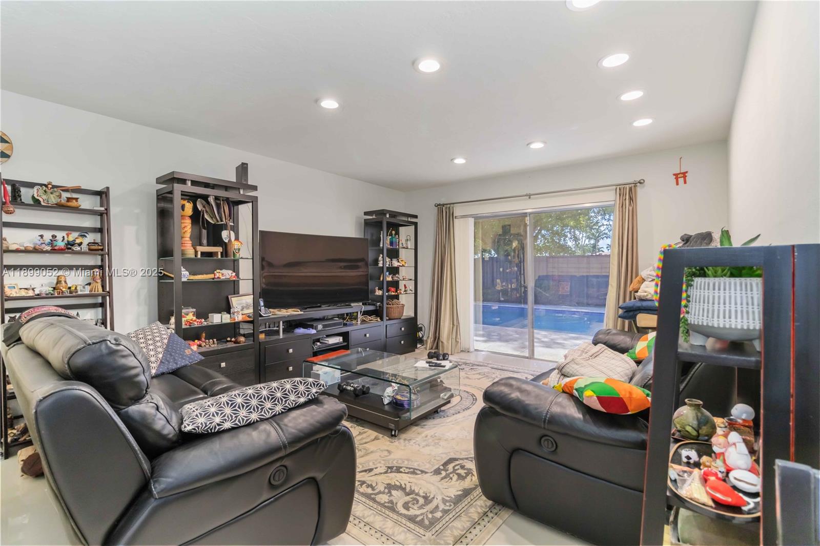 Nestled in a quiet, family-friendly community, the home welcomes you with a spacious living room, formal dining area, and a kitchen that flows seamlessly into the family room. Multiple glass sliding doors from the living, family, and kitchen spaces open directly to the sparkling pool—creating an entertainer’s paradise and effortless indoor-outdoor living.
