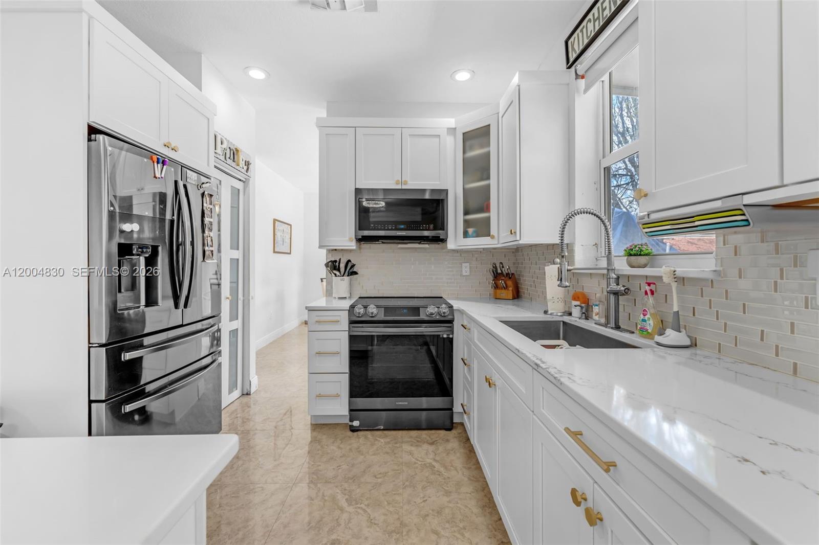 The updated high-end kitchen includes modern finishes and is complemented by LG washer and dryer, adding both style and convenience. Tile flooring throughout enhances durability and easy maintenance, while impact windows and doors provide security and energy efficiency.