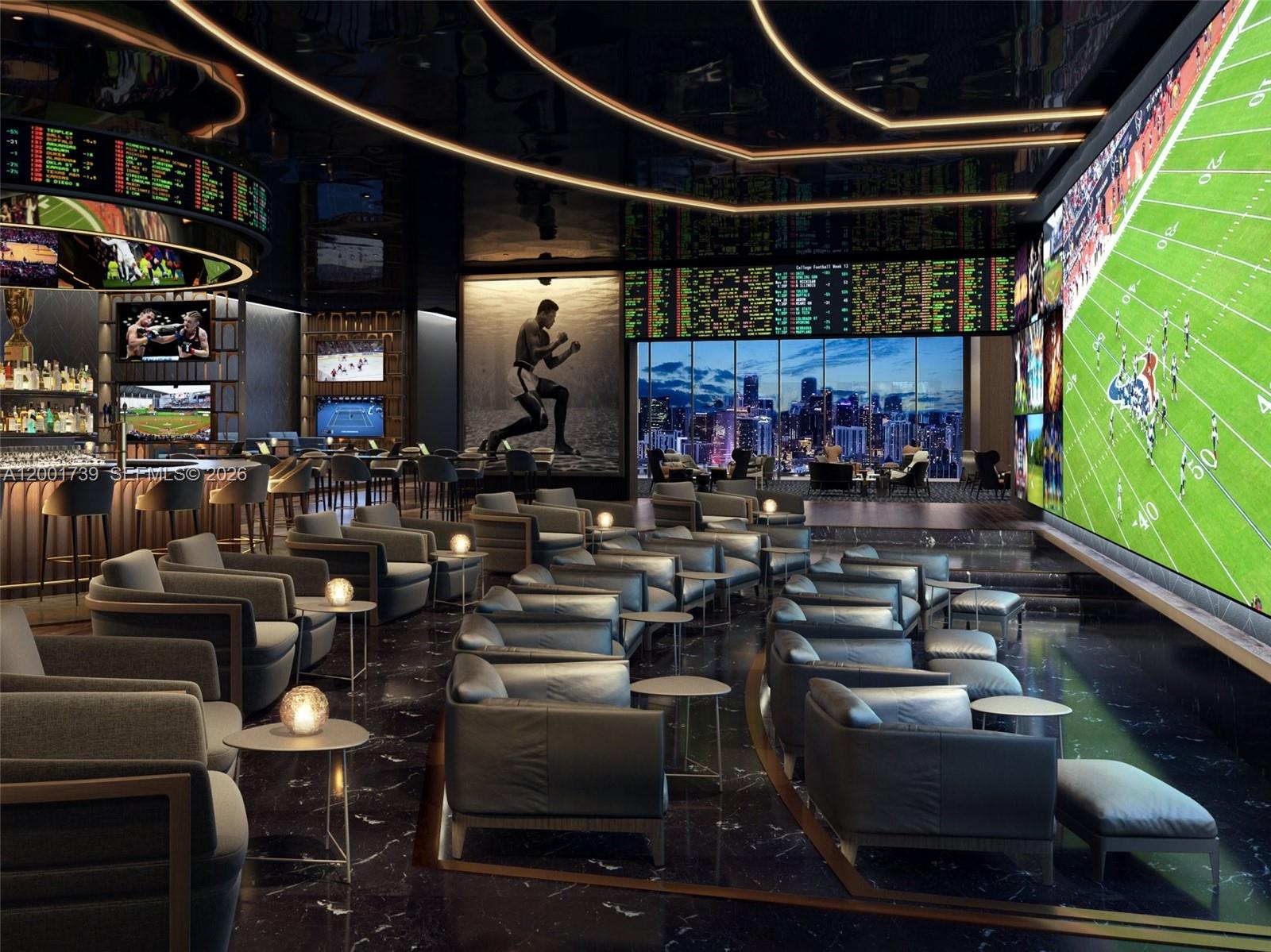 Residents enjoy premium amenities including a Chopra Spa, two on-site restaurants, resort-style pool with cabanas and spa features, sports lounge and bar, full-service hospitality, and exclusive access to a private beach club in Miami Beach.