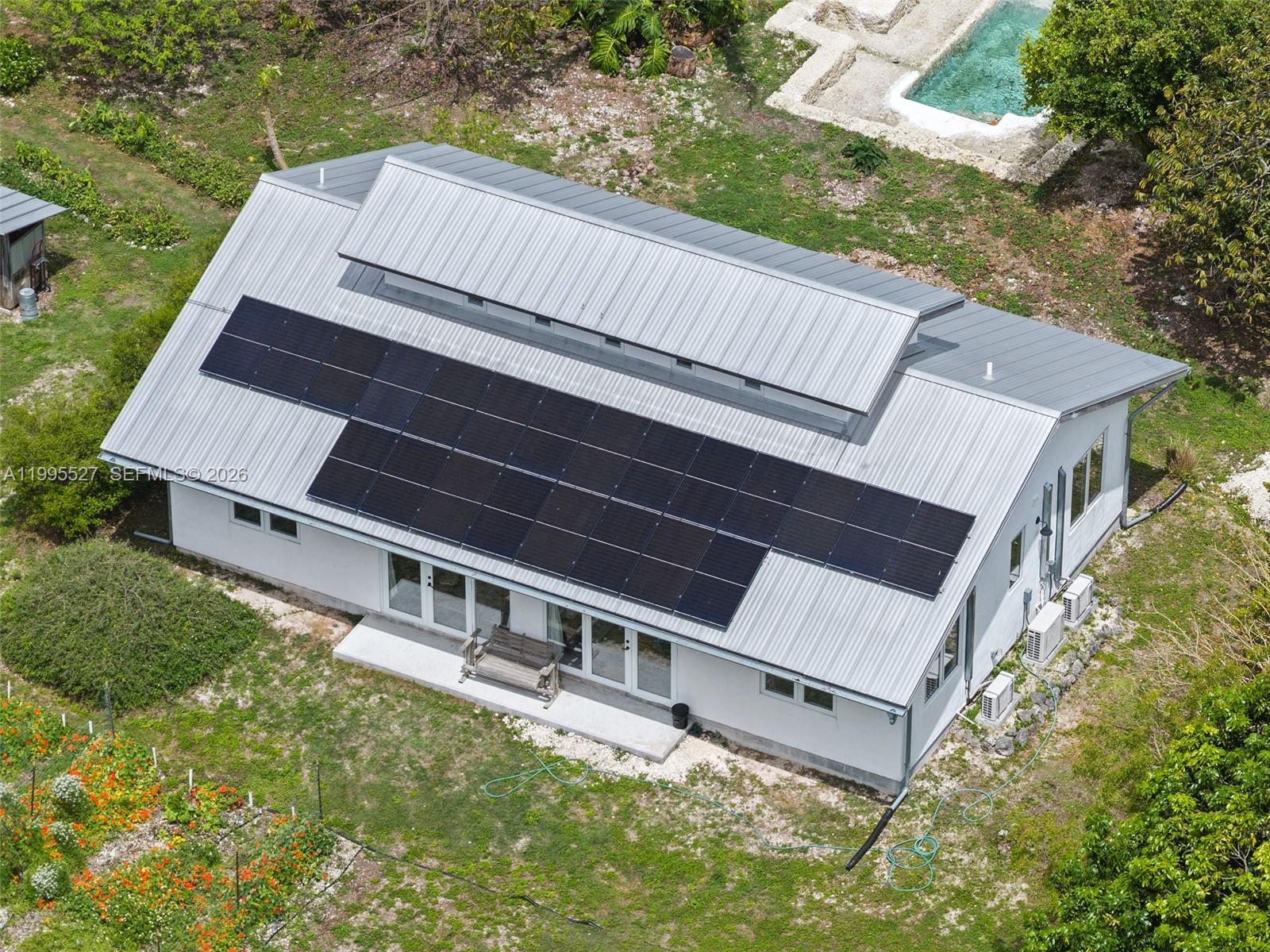 9 56 39 1.54 AC M/L E200FT OF W225FT OF N1/2 OF SW1/4 OF NE1/4 OF NW1/4 COC 24003-1317 10 2005 1 Tucked away on 1.54 lush acres in the Redlands, this thoughtfully designed eco-friendly, owner-built estate blends sustainability with serene living. Completed in 2022, the 3BD/2BA residence offers 1,500 SF plus a charming 200 SF loft—ideal for office, studio, or retreat—accessed by a beautiful wood staircase. Enjoy a light-filled interior, solar panels, and two potable wells for home and agriculture. Outdoors, discover a swimmable grotto with waterfall, greenhouse, three outbuildings, and organic garden. A tropical paradise with over 60 tree orchard including mango, avocado, lychee, mamey, jackfruit, and more—Enjoy your private farm-to-table sanctuary.