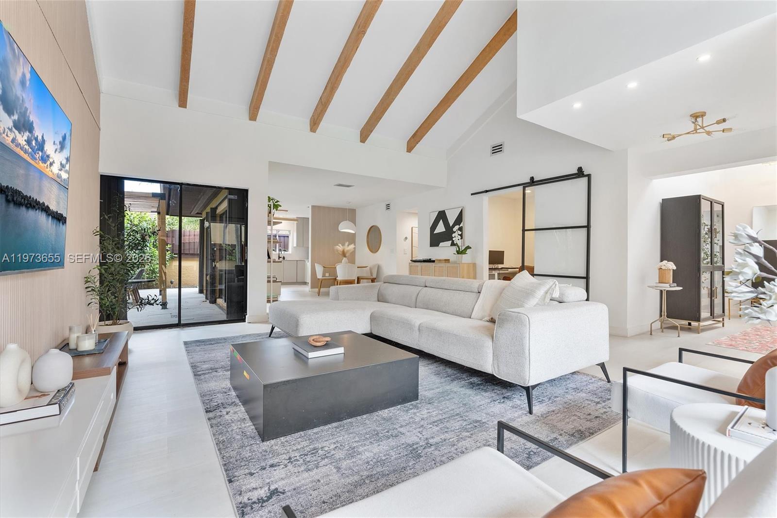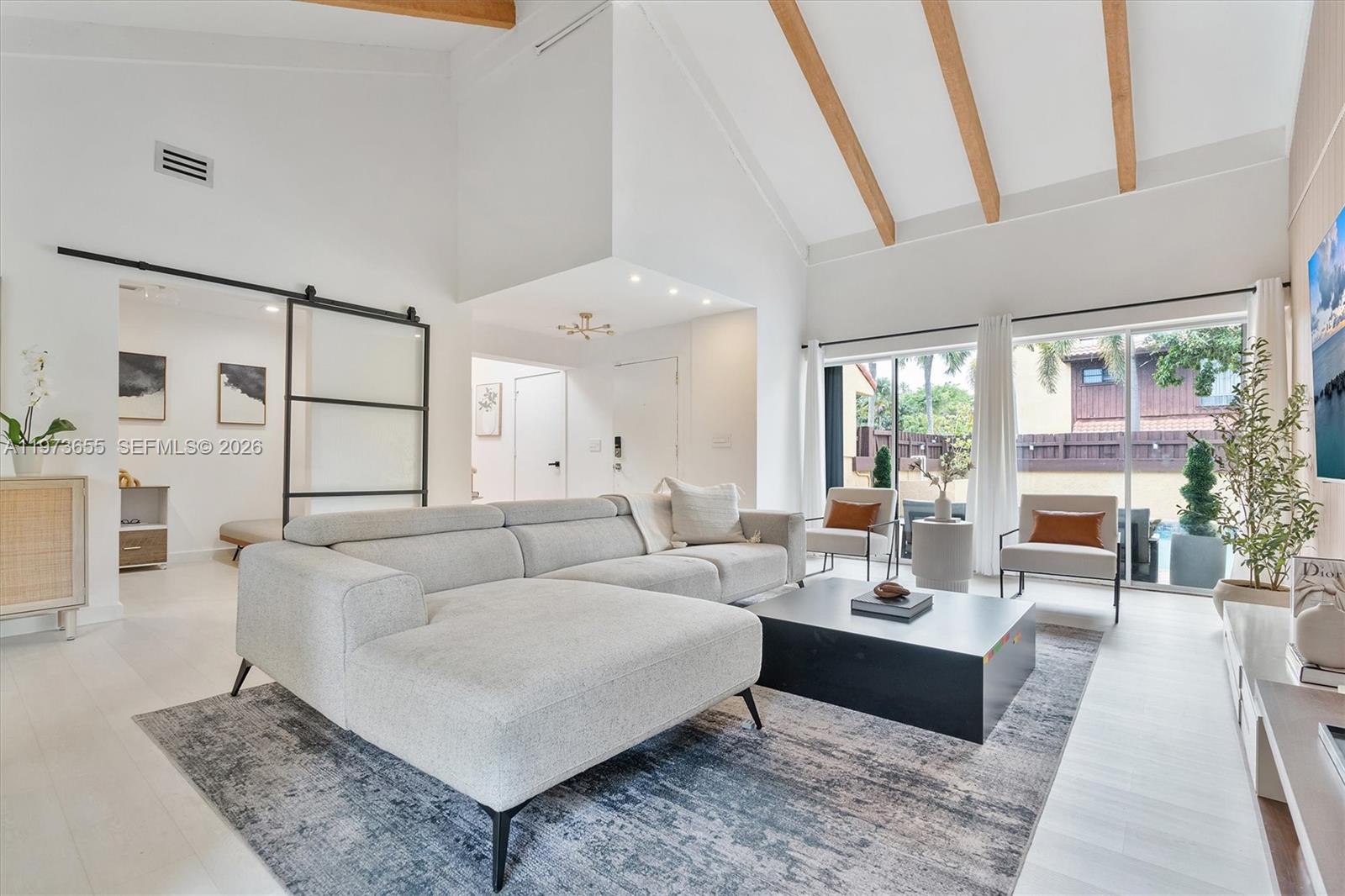 SKY LAKE VILLAS FIRST ADDN TO PB 107-4 LOT 42 BLK 5 & PROP INT IN & TO COMMON ELEMENTS LOT SIZE 4410 SQ FT OR 20242-1655 0202 1 COC 21921-26 ***OPEN HOUSE APRIL,11. LOOK FOR MARISA KOOIMA ON CALL BOX FOR ACCESS*** Welcome to this completely redesigned 2-bedroom, 2-bathroom home with a flex room perfect for a den, office, or guest space. The open-concept kitchen is the heart of the home, featuring a quartzite waterfall island and 2025 Samsung Bespoke smart appliances, ideal for cooking or entertaining. Smooth skim-coated walls and ceilings, fresh white paint, luxury vinyl flooring, and square hi-hat lighting create a bright, modern atmosphere throughout. Exposed wood beams have been sanded to their natural color, adding warmth and character, while decorative slat wall panels, custom wallpaper, updated air vents, modern fixtures, and LE Grand light switches elevate the details. The garage is already plumbed for an additional bedroom and bathroom, with plans available, offering a rare opportunity to expand living space. Just outside you'll find a heated saltwater courtyard pool with a papered deck, perfect for private, year-round enjoyment. Major updates include a 2024 flat roof, 2018 HVAC, and updated water heater. Maintenance includes paint, WiFi, cable, and front yard care. A turnkey home with luxury finishes, thoughtful upgrades, and room to grow. This property will not last.