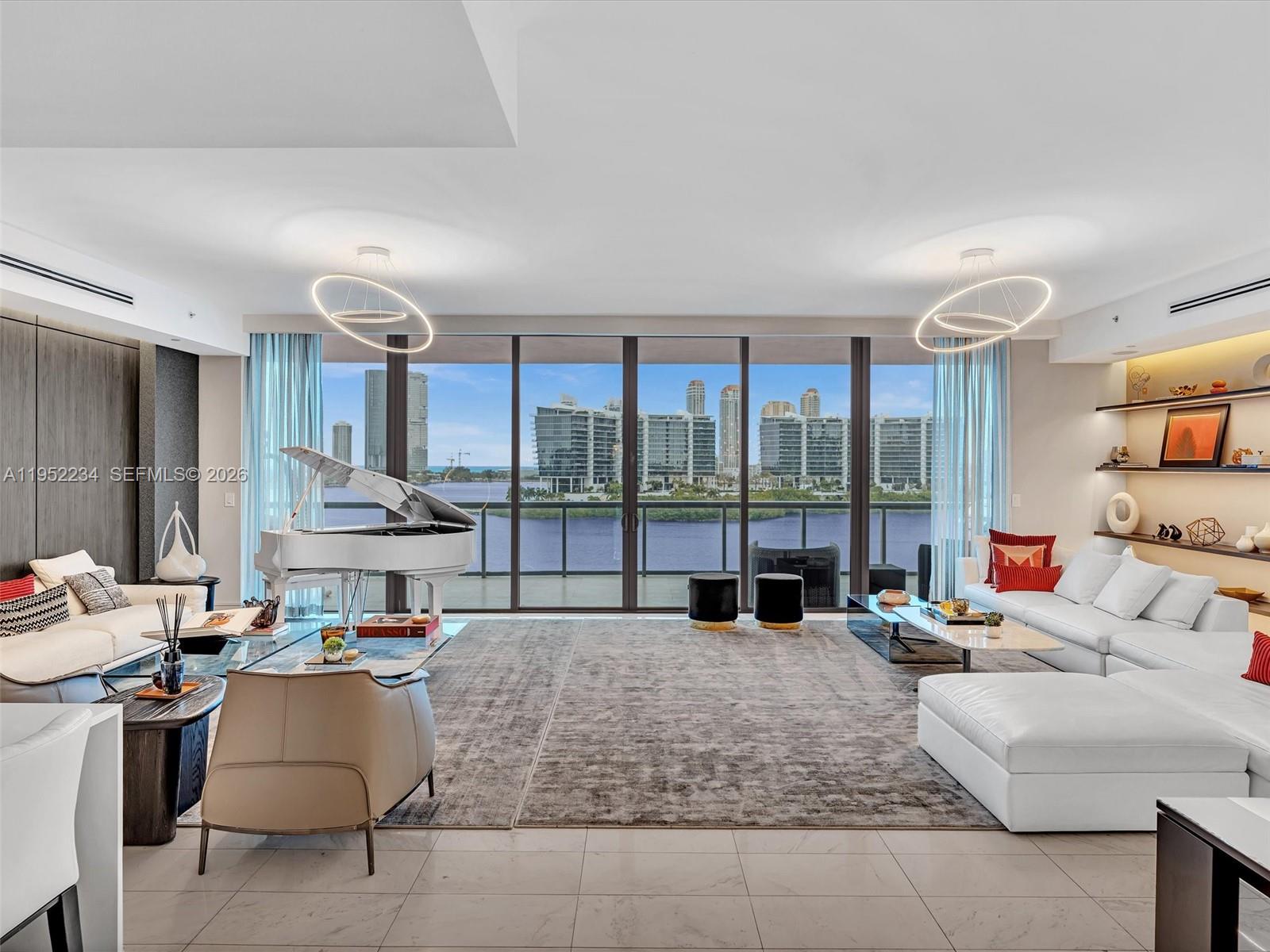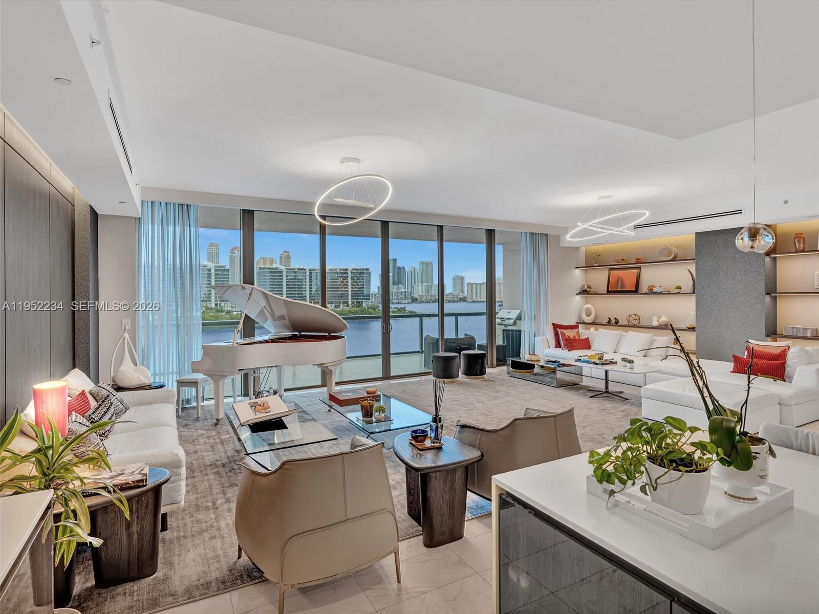 ECHO CONDO UNIT 718 UNDIV 0.7675% INT IN COMMON ELEMENTS OFF REC 28543-4901 Arrive via private elevator to breathtaking ocean and bay views from this premier corner residence at Echo Aventura. Offering 3,801 SF of interior living space, the home is filled with natural light, enhanced by floor-to-ceiling glass and soaring ceilings. The residence features four bedrooms plus a den, 5.5 baths, and a separate service suite with full bath and laundry, ideal for staff quarters or flexible additional living space. Interiors curated by renowned designer Guimar Urbina showcase custom finishes and high-end materials throughout, with every detail thoughtfully tailored to perfection. Ideal for both everyday living and entertaining, the home includes a chef’s kitchen with Sub-Zero refrigeration and Wolf gas range, integrated smart-home technology with in-ceiling audio, and an expansive terrace with summer kitchen and BBQ. The primary suite offers a tranquil retreat with a generous walk-in closet and spa-inspired bath. Echo Aventura delivers true resort-style living with a bayfront infinity-edge pool, state-of-the-art fitness center with yoga studio, café/restaurant, dog services, and full-service luxury amenities