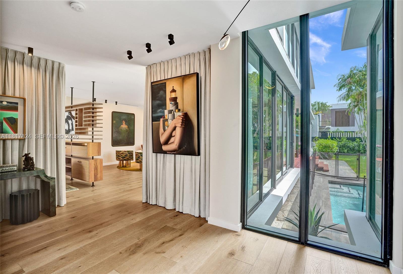 CAMNER GABLES 2ND ADDN PB 48-89 LOT 5 BLK 9 LOT SIZE 60.000 X 108 Walls of glass bathe this striking residence in natural light blending indoors & out with views of lush grounds, covered patio & pool. Conceived by award-winning Brillhart Architecture & featured in Architectural Digest. No expense spared by owner for their vision showcasing bespoke interiors by Mr. Alex Tate Design. Primary suite with private balcony & primary bath with dual head shower & hand carved sinks plus 2 additional ensuite bedrooms are upstairs. 4th independent ensuite bedroom is downstairs. Highlights include chef’s kitchen with Wolf, Sub-Zero & Blue Star appliances, standalone coffee station, striking IPE staircase & smart home features. Located on a quiet corner with low traffic enclave just 250 feet from the lush Banyan trees of Merry Christmas Park accessible by private gate