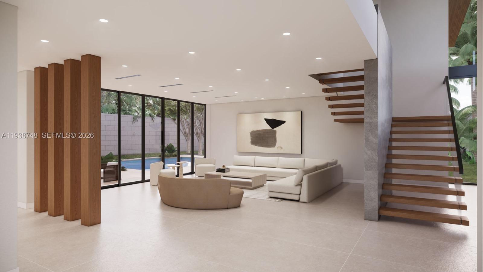 The chef’s kitchen features German cabinetry, natural stone countertops, and a full suite of Sub-Zero, Wolf, and Miele appliances. An impressive 11-foot pivot door opens to a dramatic double-height foyer with a floating solid-wood staircase and glass railings. The main level features 10-foot ceilings, oversized Spanish porcelain-slab flooring, a full-size office, and a guest suite overlooking the pool and expansive backyard.