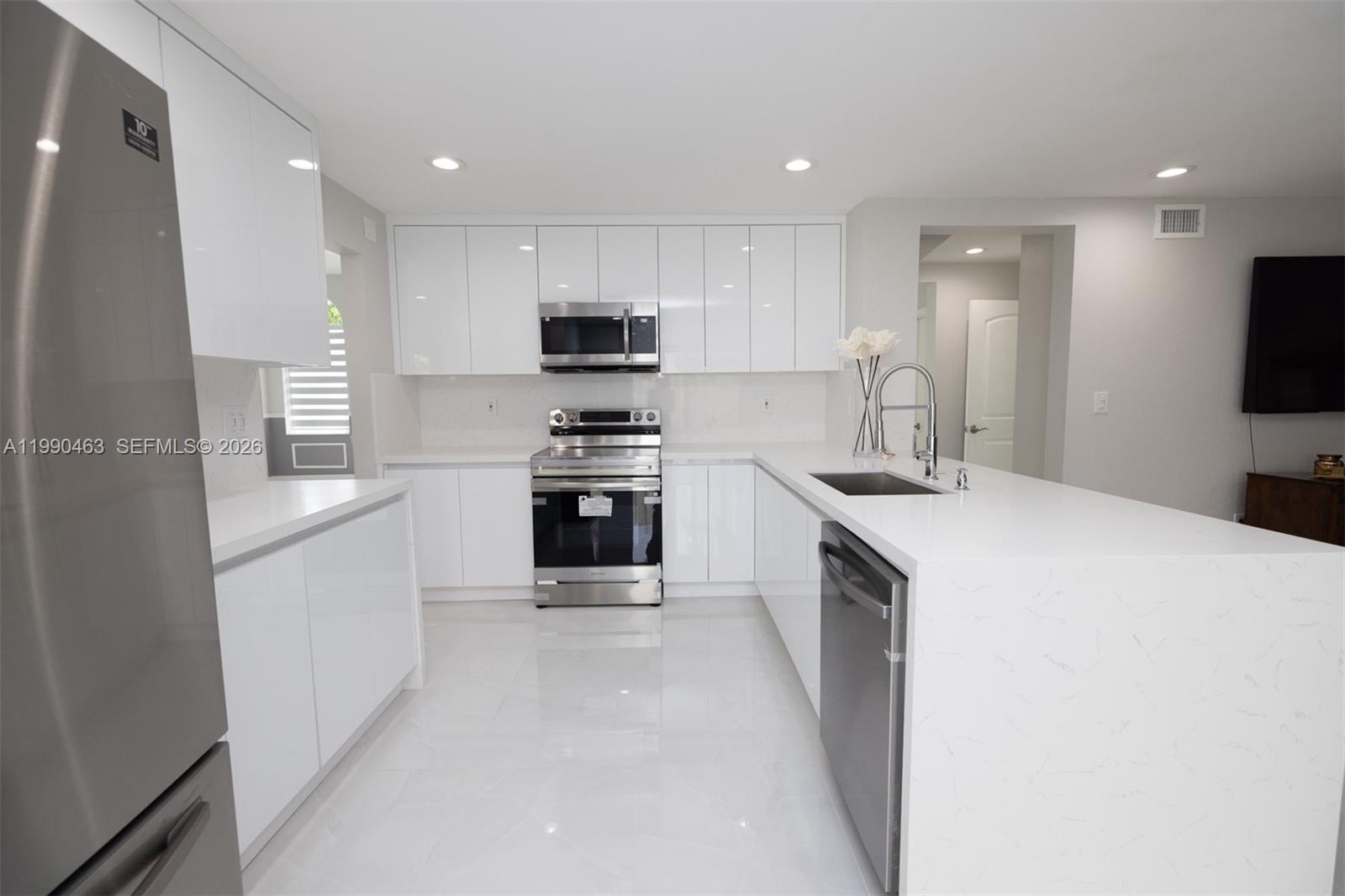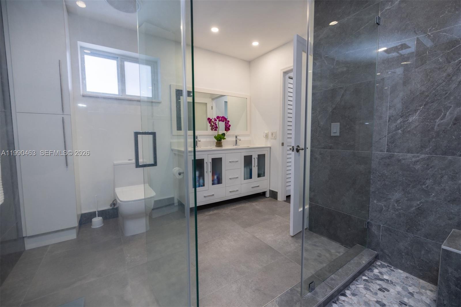 POINCIANA AT SUNSET LAKES ESTATES PB 144-83 T-18424 LOT 27 BLK 6 LOT SIZE 4500 SQ FT F/A/U 30-4932-014-0050 OR 16935-0715 0995 1 SHOWCASE HOME in the coveted guard-gated community of Poinciana at Sunset Lakes Estates. From the new porcelain floors and complete impact glass to the flat tile roof, it has been completely remodeled with impeccable taste and standards. Volume ceilings elevate the formal living room while the dining room overlooks the large covered patio. Gaze at the dream kitchen with never-used appliances that adjoins the family room. The layout offers 4 bed/3 renovated baths including 1bed/1bath on the first floor plus a in-law suite. The primary suite features his & her closets and a luxurious bath with dual vanity & walk-in shower. Low HOA. Great park right across from the guard house, excellent schools and shops & dining on Kendall Dr. just minutes away.